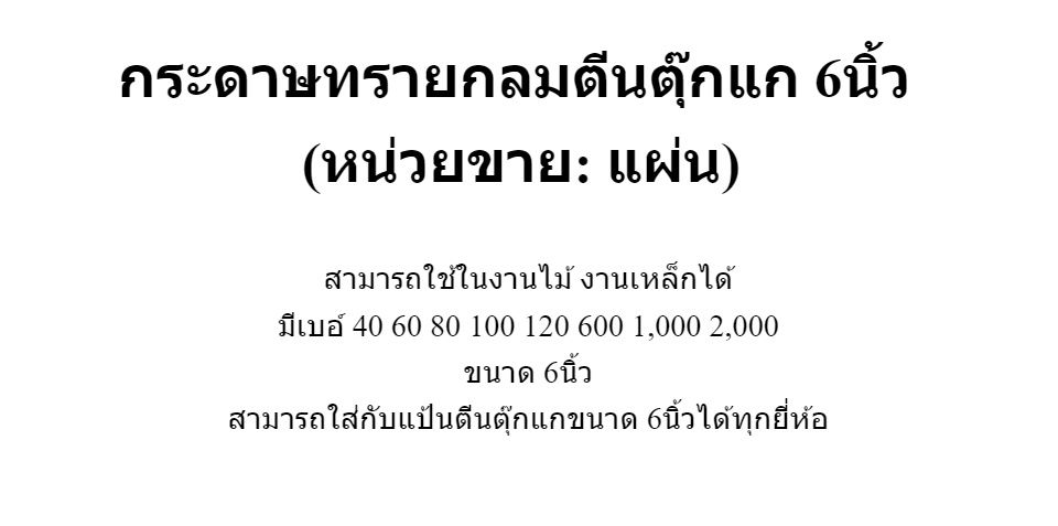 กระดาษทรายกลมตีนตุ๊กแก 6นิ้ว (หน่วยขาย: แผ่น) สามารถใช้ในงานไม้ งานเหล็กได้ มีเบอ์ 40 60 80 100 120 600 1,000 2,000 ขนาด 6นิ้ว สามารถใส่กับแป้นตีนตุ๊กแกขนาด 6นิ้วได้ทุกยี่ห้อ