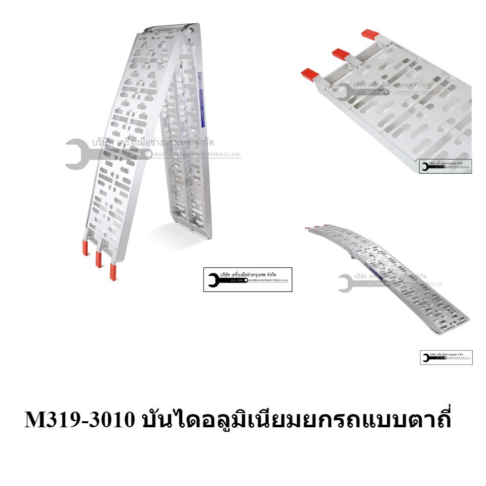 GBR-903 บันไดอลูมิเนียม สำหรับเคลื่อนย้ายรถ ยกรถ มอเตอร์ไซค์ มินิไบค์-บิ๊กไบค์, รถตัดหญ้าแบบนั่งขับ และ ATV บันไดทำจากวัสดุอลูมิเนียม น้ำหนักเบา ใช้เคลื่อนย้ายรถมอเตอร์ไซค์ ขึ้นรถกระบะ หรือขึ้นที่สูงต่างระดับ รับน้ำหนักได้สูงสุด 340 kg ขนาดบันได (กางออก) : 2250 mm × 280 mm ×50 mm ขนาดบันได (พับแล้ว) : 1160 mm × 150 mm × 305 mm M319-3010 บันไดอลูมิเนียมยกรถ แบบตาถี่ 400 บันไดอลูมิเนียมยกรถ