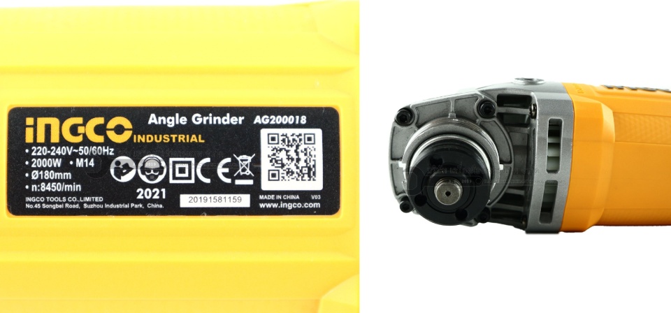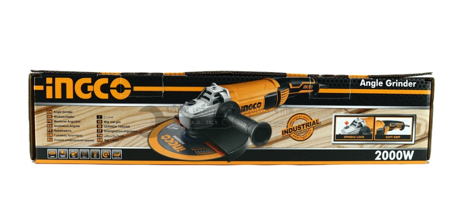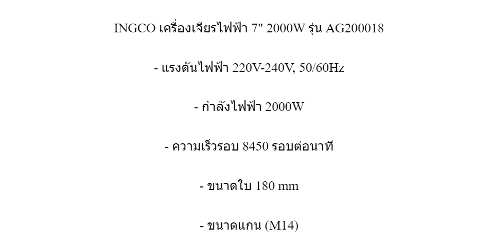 INGCO เครื่องเจียรไฟฟ้า 7" 2000W รุ่น AG200018 - แรงดันไฟฟ้า 220V-240V, 50/60Hz - กำลังไฟฟ้า 2000W - ความเร็วรอบ 8450 รอบต่อนาที - ขนาดใบ 180 mm - ขนาดแกน (M14)