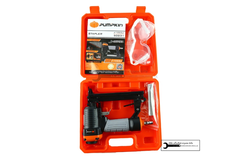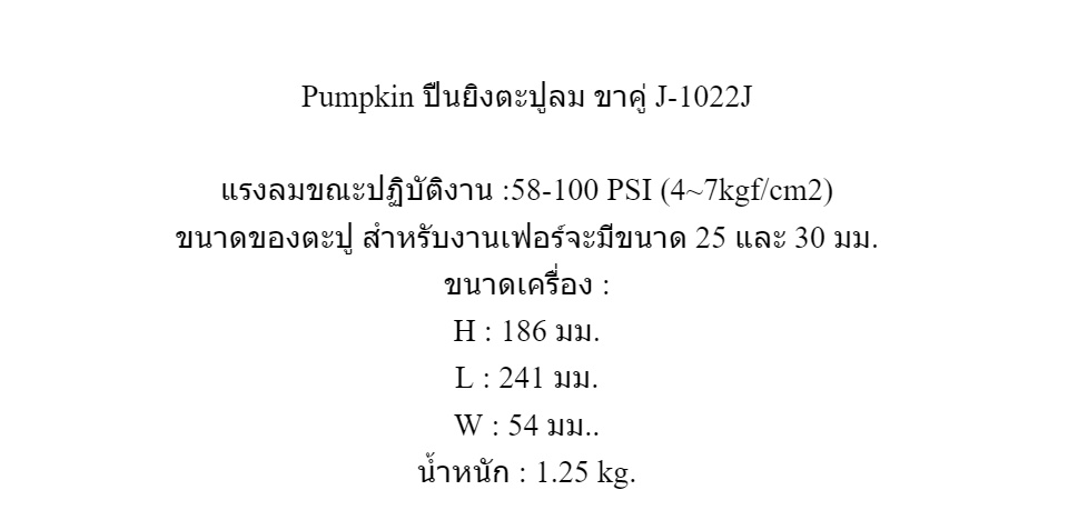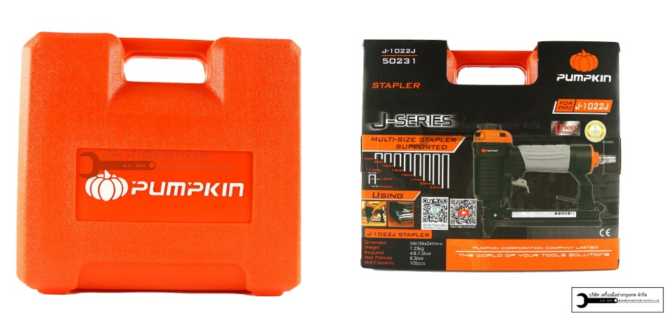 Pumpkin ปืนยิงตะปูลม เครื่องยิงตะปู ปืนยิงเเม็กซ์ ขาคู่ รุ่น J-1022J Pumpkin ปืนยิงตะปูลม ขาคู่ J-1022J แรงลมขณะปฏิบัติงาน :58-100 PSI (4~7kgf/cm2) ขนาดของตะปู สำหรับงานเฟอร์จะมีขนาด 25 และ 30 มม. ขนาดเครื่อง : H : 186 มม. L : 241 มม. W : 54 มม.. น้ำหนัก : 1.25 kg.