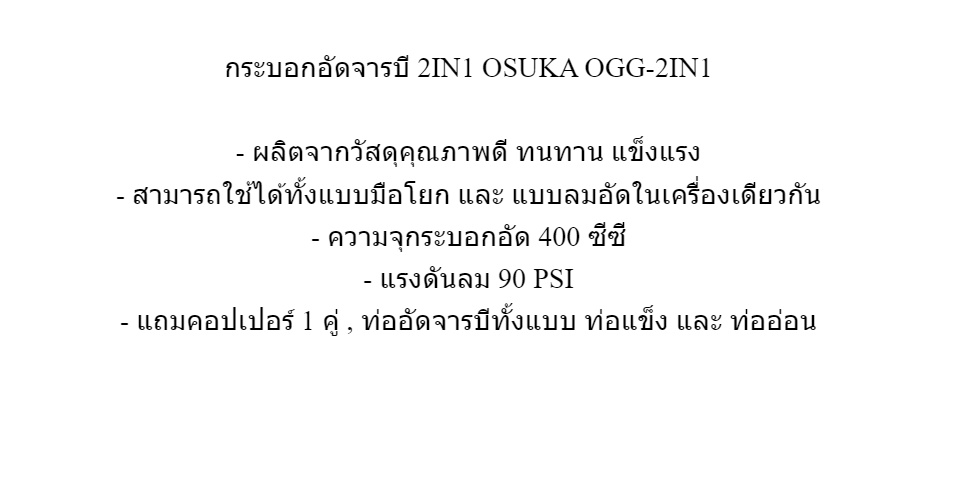 กระบอกอัดจารบี 2IN1 OSUKA OGG-2IN1 - ผลิตจากวัสดุคุณภาพดี ทนทาน แข็งแรง - สามารถใช้ได้ทั้งแบบมือโยก และ แบบลมอัดในเครื่องเดียวกัน - ความจุกระบอกอัด 400 ซีซี - แรงดันลม 90 PSI - แถมคอปเปอร์ 1 คู่ , ท่ออัดจารบีทั้งแบบ ท่อแข็ง และ ท่ออ่อน