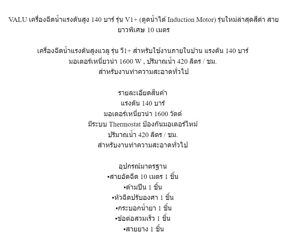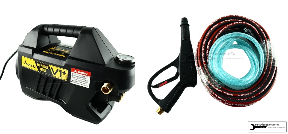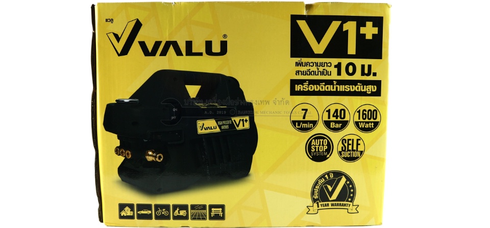 VALU เครื่องฉีดน้ำแรงดันสูง 140 บาร์ รุ่น V1+ (ดูดน้ำได้ Induction Motor) รุ่นใหม่ล่าสุดสีดำ สายยาวพิเศษ 10 เมตร เครื่องฉีดน้ำแรงดันสูงแวลู รุ่น วี1+ สำหรับใช้งานภายในบ้าน แรงดัน 140 บาร์ มอเตอร์เหนี่ยวนำ 1600 W , ปริมาณน้ำ 420 ลิตร / ชม. สำหรับงานทำความสะอาดทั่วไป รายละเอียดสินค้า แรงดัน 140 บาร์ มอเตอร์เหนี่ยวนำ 1600 วัตต์ มีระบบ Thermostat ป้องกันมอเตอร์ไหม้ ปริมาณน้ำ 420 ลิตร / ชม. สำหรับงานทำความสะอาดทั่วไป อุปกรณ์มาตรฐาน •สายอัดฉีด 10 เมตร 1 ชิ้น •ด้ามปืน 1 ชิ้น •หัวฉีดปรับองศา 1 ชิ้น •กระบอกน้ำยา 1 ชิ้น •ข้อต่อสวมเร็ว 1 ชิ้น •สายยาง 1 ชิ้น