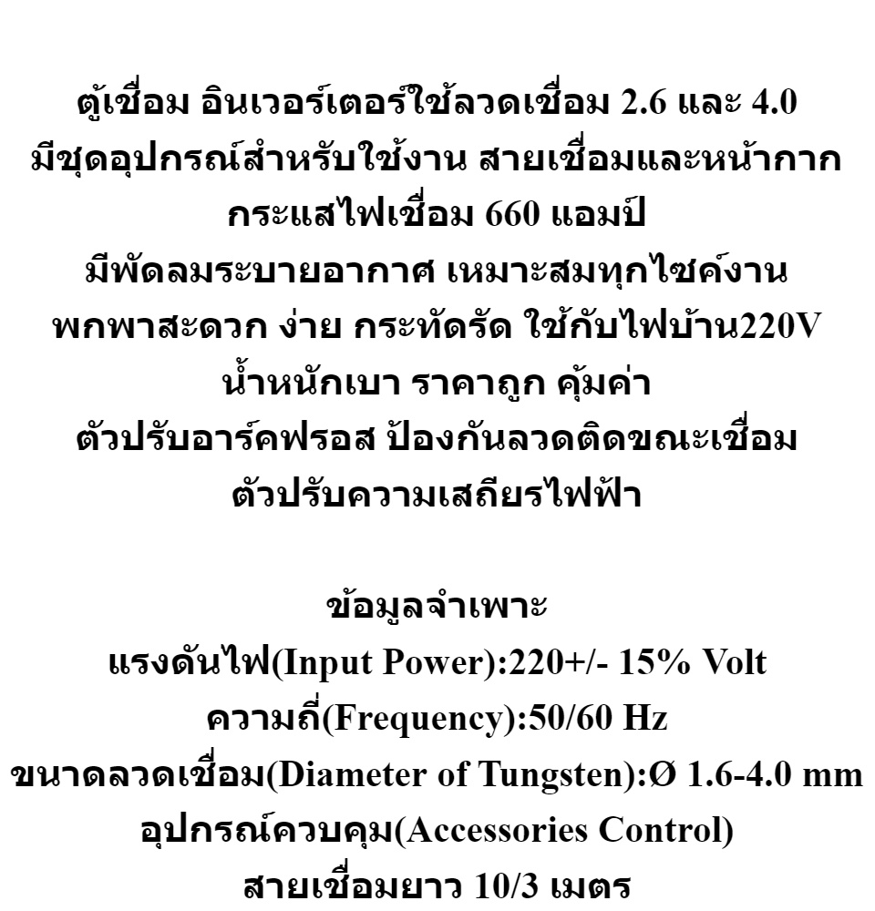 ↵ ตู้เชื่อม อินเวอร์เตอร์ใช้ลวดเชื่อม 2.6 3.2 และ 4.0 มีชุดอุปกรณ์สำหรับใช้งาน สายเชื่อมและหน้ากาก กระแสไฟเชื่อม 660 แอมป์ มีพัดลมระบายอากาศ เหมาะสมทุกไซค์งาน พกพาสะดวก ง่าย กระทัดรัด ใช้กับไฟบ้าน220V ตัวปรับอาร์คฟรอส ป้องกันลวดติดขณะเชื่อม ตัวปรับความเสถียรไฟฟ้า แรงดันไฟ(Input Power):220+/- 15% Volt ความถี่(Frequency):50/60 Hz ขนาดลวดเชื่อม(Diameter of Tungsten):Ø 1.6-4.0 mm อุปกรณ์ควบคุม(Accessories Control) สายเชื่อมยาว 10 สายดินยาว3 เมตร กระแสไฟเชื่อม 660 แอมป์