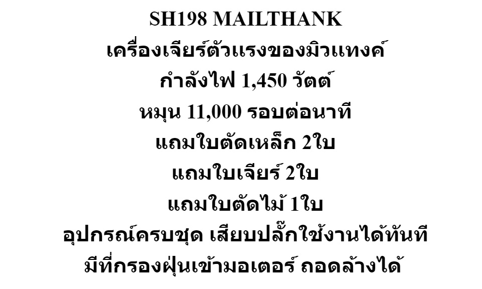 SH198 MAILTHANK เครื่องเจียร์ตัวเเรงของมิวเเทงค์ กำลังไฟ 1,450 วัตต์ หมุน 11,000 รอบต่อนาที แถมใบตัดเหล็ก 2ใบ แถมใบเจียร์ 2ใบ แถมใบตัดไม้ 1ใบ อุปกรณ์ครบชุด เสียบปลั๊กใช้งานได้ทันที มีที่กรองฝุ่นเข้ามอเตอร์ ถอดล้างได้