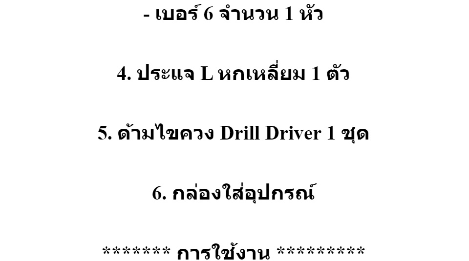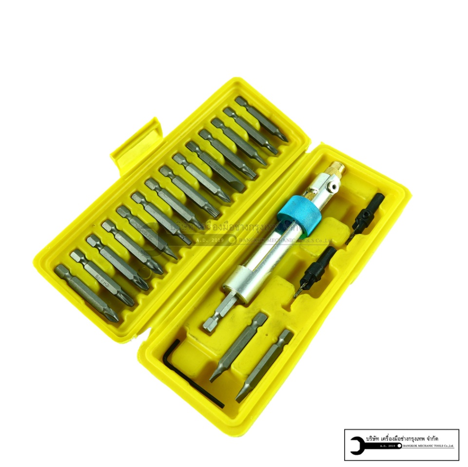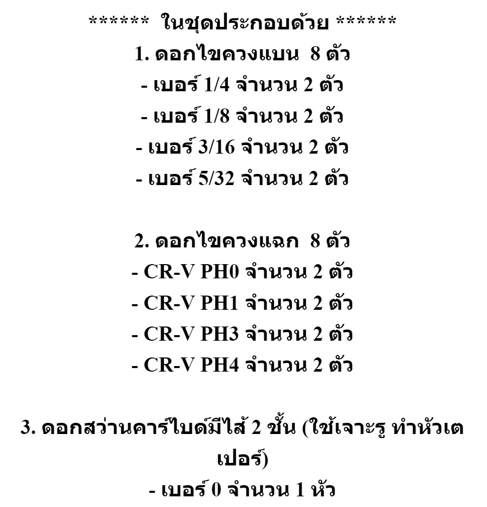 ****** ในชุดประกอบด้วย ****** 1. ดอกไขควงแบน 8 ตัว - เบอร์ 1/4 จำนวน 2 ตัว - เบอร์ 1/8 จำนวน 2 ตัว - เบอร์ 3/16 จำนวน 2 ตัว - เบอร์ 5/32 จำนวน 2 ตัว 2. ดอกไขควงแฉก 8 ตัว - CR-V PH0 จำนวน 2 ตัว - CR-V PH1 จำนวน 2 ตัว - CR-V PH3 จำนวน 2 ตัว - CR-V PH4 จำนวน 2 ตัว 3. ดอกสว่านคาร์ไบด์มีไส้ 2 ชั้น (ใช้เจาะรู ทำหัวเตเปอร์) - เบอร์ 0 จำนวน 1 หัว - เบอร์ 6 จำนวน 1 หัว 4. ประแจ L หกเหลี่ยม 1 ตัว 5. ด้ามไขควง Drill Driver 1 ชุด 6. กล่องใส่อุปกรณ์ ******* การใช้งาน ********* 1.สวมก้านหกเหลี่ยมของ Drill Driver เข้ากับหัวจับดอกสว่าน 2.ตรวจสอบดูให้แน่ใจว่าก้านหกเหลี่ยมอยู่ในตำแหน่งกึ่งกลางของหัวจับดอกสว่าน จากนั้นขัน Drill Driver เข้ากับหัวจับให้แน่น 3.คลายหัวยึดเพื่อสอดดอกสว่านหรือหัวไขควงที่คุณต้องการเข้ากับ Drill Driver แล้วขันหัวยึดนี้ให้แน่นเพื่อป้องกันไม่ให้ดอกสว่านหรือหัวไขควงหลุดออกมา 4.เลื่อนปลอกลงมาที่สว่านและหมุนปลายหัวขึ้น จากนั้นให้คลายหัวยึดออกเพื่อติดตั้งดอกสว่านหรือหัวไขควงอันที่สองเข้าไป แล้วขันหัวยึดเข้ากับดอกสว่านให้แน่น 5.สุดท้ายให้ล๊อกหัวเจาะนี้ด้วยการเลื่อนปลอกกลับไปที่ตำแหน่งเดิม