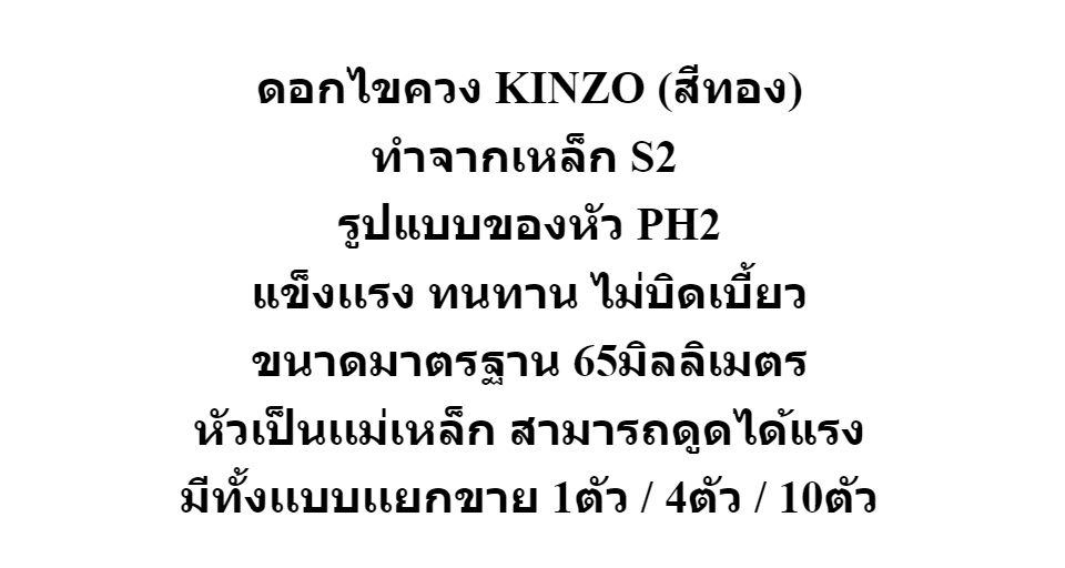 ดอกไขควง KINZO (สีทอง) ทำจากเหล็ก S2 รูปแบบของหัว PH2 แข็งเเรง ทนทาน ไม่บิดเบี้ยว ขนาดมาตรฐาน 65มิลลิเมตร หัวเป็นเเม่เหล็ก สามารถดูดได้แรง มีทั้งเเบบเเยกขาย 1ตัว / 4ตัว / 10ตัว