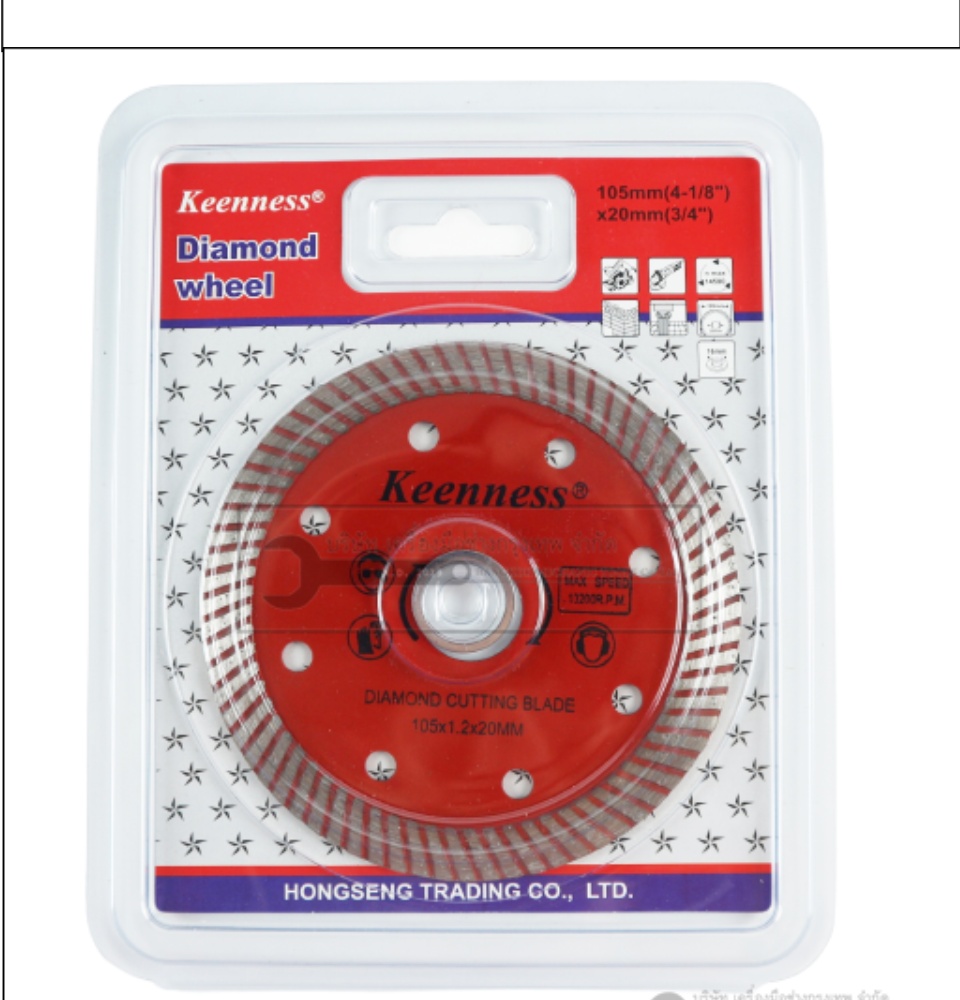 KEENNESS ใบเพชร ตัดกระเบื้อง 4 นิ้ว บาง 1 มิล รายละเอียดสินค้า สำหรับ ลูกหมู เครื่องเจียร 4 นิ้ว ใบตัด ใบตัดปูน ใบตัดคอนกรีต แผ่นบิปซั่ม 2 in 1 ใบตัด- รูวงใน 20 มิล ตัวใบบาง 1.0 มิล เพชรหนา 1.2 มิล- ตัดแม่นยำ ไม่กินเนื้องาน!!- ใช้สำหรับตัดกระเบื้อง หินอ่อน หินแกรนิต คอนกรีต แผ่นพื้น