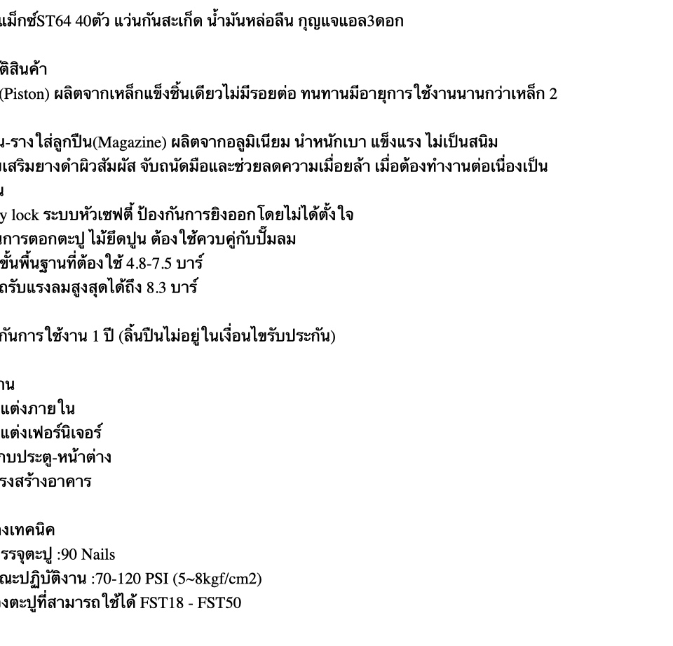 PUMPKIN เครื่องยิงตะปู ปืนยิงตะปู ปืนลมยิงตะปู ยิงปูน J-series รุ่น J-FST50A รับประกัน1ปี แถม ลูกแม็กซ์ST64 40ตัว แว่นกันสะเก็ด น้ำมันหล่อลืน กุญแจแอล3ดอก คุณสมบัติสินค้า - ลิ้นปืน (Piston) ผลิตจากเหล็กแข็งชิ้นเดียวไม่มีรอยต่อ ทนทานมีอายุการใช้งานนานกว่าเหล็ก 2 ชิ้น - ตัวเรือน-รางใส่ลูกปืน(Magazine) ผลิตจากอลูมิเนียม นำหนักเบา แข็งแรง ไม่เป็นสนิม - ด้ามจับเสริมยางดำผิวสัมผัส จับถนัดมือและช่วยลดความเมื่อยล้า เมื่อต้องทำงานต่อเนื่องเป็นเวลานาน - มี safety lock ระบบหัวเซฟตี้ ป้องกันการยิงออกโดยไม่ได้ตั้งใจ - ใช้แทนการตอกตะปู ไม้ยึดปูน ต้องใช้ควบคู่กับปั๊มลม - แรงดันขั้นพื้นฐานที่ต้องใช้ 4.8-7.5 บาร์ - สามารถรับแรงลมสูงสุดได้ถึง 8.3 บาร์ - รับประกันการใช้งาน 1 ปี (ลิ้นปืนไม่อยู่ในเงื่อนไขรับประกัน) การใช้งาน - งานตกแต่งภายใน - งานตกแต่งเฟอร์นิเจอร์ - งานวงกบประตู-หน้าต่าง - งานโครงสร้างอาคาร ข้อมูลทางเทคนิค จำนวนบรรจุตะปู :90 Nails แรงลมขณะปฏิบัติงาน :70-120 PSI (5~8kgf/cm2) ขนาดของตะปูที่สามารถใช้ได้ FST18 - FST50 ขนาดเครื่อง : H : 303 มม. L : 280 มม. W : 80 มม.. น้ำหนัก : 2.3 kg.