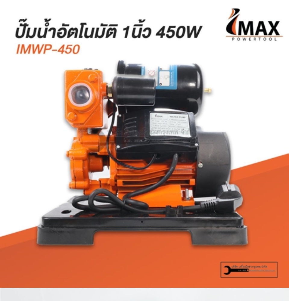 IMAX ปั๊มน้ำอัตโนมัติ รุ่นฝาครอบ ท่อ 1 นิ้ว IMWP-450 มีฝาครอบได้มาตรฐานการผลิต ISO 9001ใบพัดผลิตจากทองเหลืองไม่เป็นสนิมใบพัดผลิตจากทองเหลืองไม่เป็นสนิม มาพร้อมสายไฟยาว 1.2 เมตรจ่ายปริมาณน้ำได้ 30 ลิตร/นาทีได้มาตรฐานการผลิต ISO 9001ใช้ไฟฟ้าบ้าน 220 V 50Hz.กำลังไฟ 550 วัตต์ 2,800 รอบ/นาทีขนาดท่อ 1" x 1”ดูดน้ำลึก 8 เมตรส่งสูง 23 เมตรน้ำหนักรวม 10.2 กิโลกรัมใบพัดผลิตจากทองเหลืองไม่เป็นสนิม มาพร้อมสายไฟยาว 1.2 เมตรจ่ายปริมาณน้ำได้ 30 ลิตร/นาทีได้มาตรฐานการผลิต ISO 9001ใช้ไฟฟ้าบ้าน 220 V 50Hz.กำลังไฟ 550 วัตต์ 2,800 รอบ/นาทีขนาดท่อ 1" x 1”ดูดน้ำลึก 8 เมตรส่งสูง 23 เมตรน้ำหนักรวม 10.2 กิโลกรัม