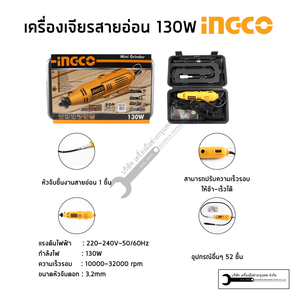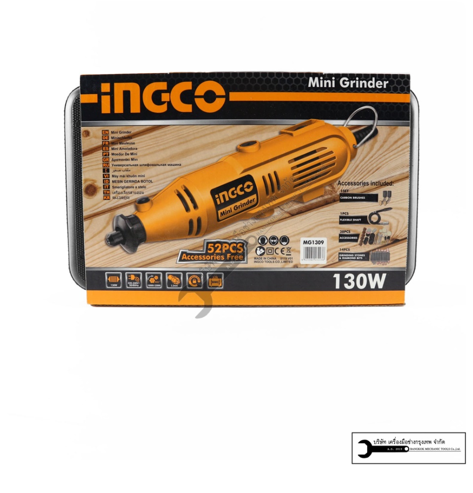 INGCO เครื่องเจียรสายอ่อน 130W รุ่น MG1309 แรงดันไฟฟ้า 220-240V~50/60Hzแรงดันไฟฟ้า 220-240V~50/60Hzกำลังไฟ 130Wความเร็วรอบ 10000-32000 rpmขนาดหัวจับดอก 3.2mmสามารถปรับความเร็วรอบให้ช้า-เร็วได้พร้อมหัวจับชิ้นงานสายอ่อน 1 ชิ้น และอุปกรณ์อื่นๆ 52 ชิ้น#เครื่องมือช่างกรุงเทพ
