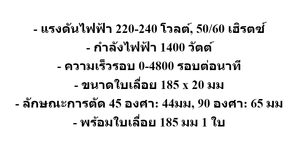 แรงดันไฟฟ้า 220-240 โวลต์, 50/60 เฮิรตซ์ กำลังไฟฟ้า 1400 วัตต์ ความเร็วรอบ 0-4800 รอบต่อนาที ขนาดใบเลื่อย 185 x 20 มม ลักษณะการตัด 45 องศา: 44มม, 90 องศา: 65 มม พร้อมใบเลื่อย 185 มม 1 ใบ รับประกัน 1 ปี
