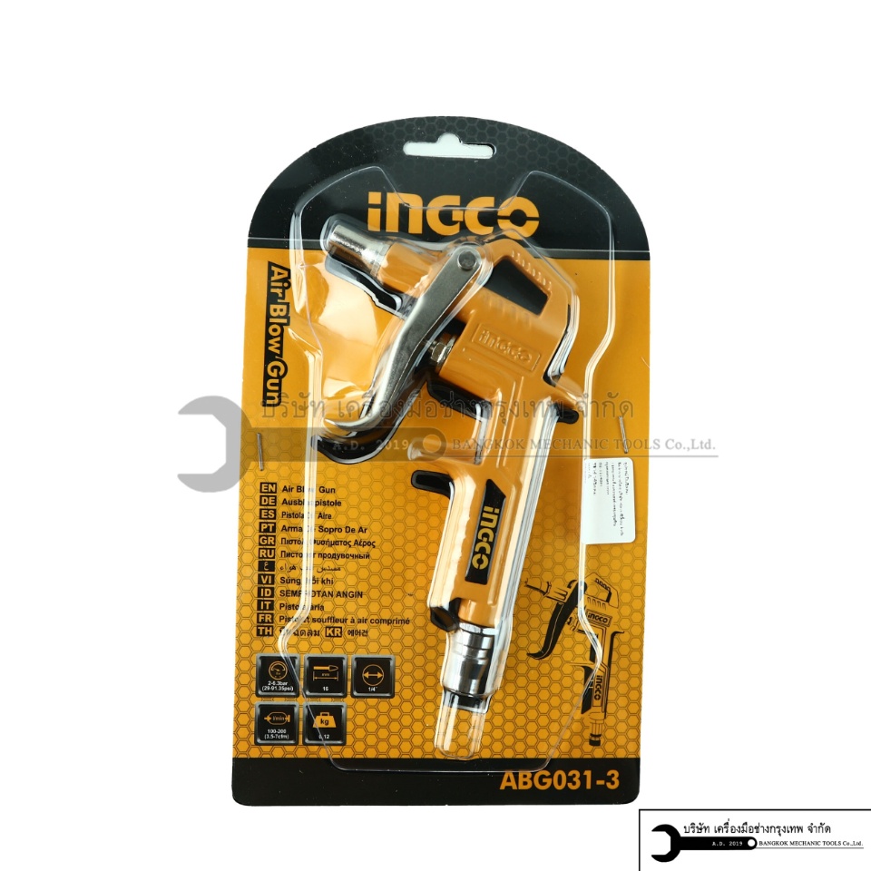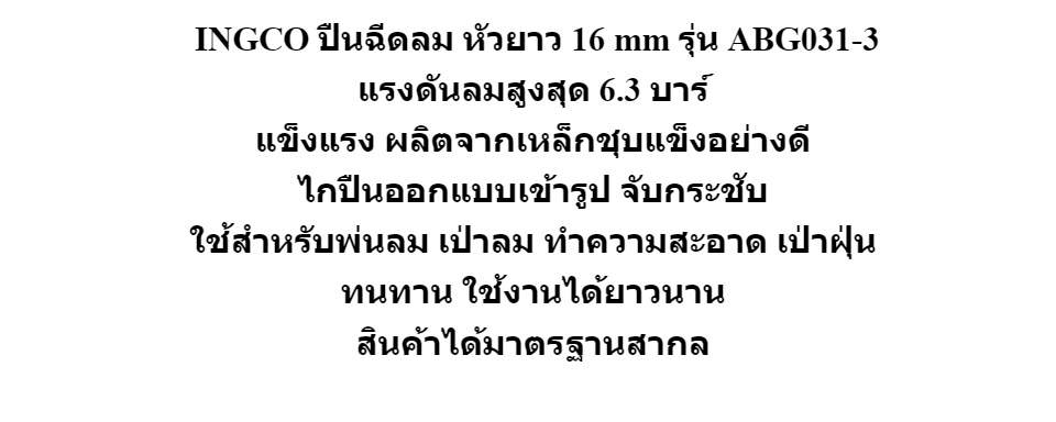 INGCO ปืนฉีดลม หัวยาว 16 mm รุ่น ABG031-3 แรงดันลมสูงสุด 6.3 บาร์ แข็งแรง ผลิตจากเหล็กชุบแข็งอย่างดี ไกปืนออกแบบเข้ารูป จับกระชับ ใช้สำหรับพ่นลม เป่าลม ทำความสะอาด เป่าฝุ่น ทนทาน ใช้งานได้ยาวนาน สินค้าได้มาตรฐานสากล
