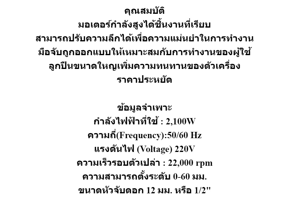 ↵คุณสมบัติ มอเตอร์กำลังสูงได้ชิ้นงานที่เรียบ สามารถปรับความลึกได้เพื่อความแม่นยำในการทำงาน มือจับถูกออกแบบให้เหมาะสมกับการทำงานของผู้ใช้ ลูกปืนขนาดใหญเพิ่มความทนทานของตัวเครื่อง ราคาประหยัด ข้อมูลจำเพาะ กำลังไฟฟ้าที่ใช้ : 2,100W ความถี่(Frequency):50/60 Hz แรงดันไฟ (Voltage) 220V ความเร็วรอบตัวเปล่า : 22,000 rpm ความสามารถตั้งระดับ 0-60 มม. ขนาดหัวจับดอก 12 มม. หรือ 1/2"