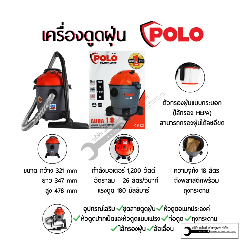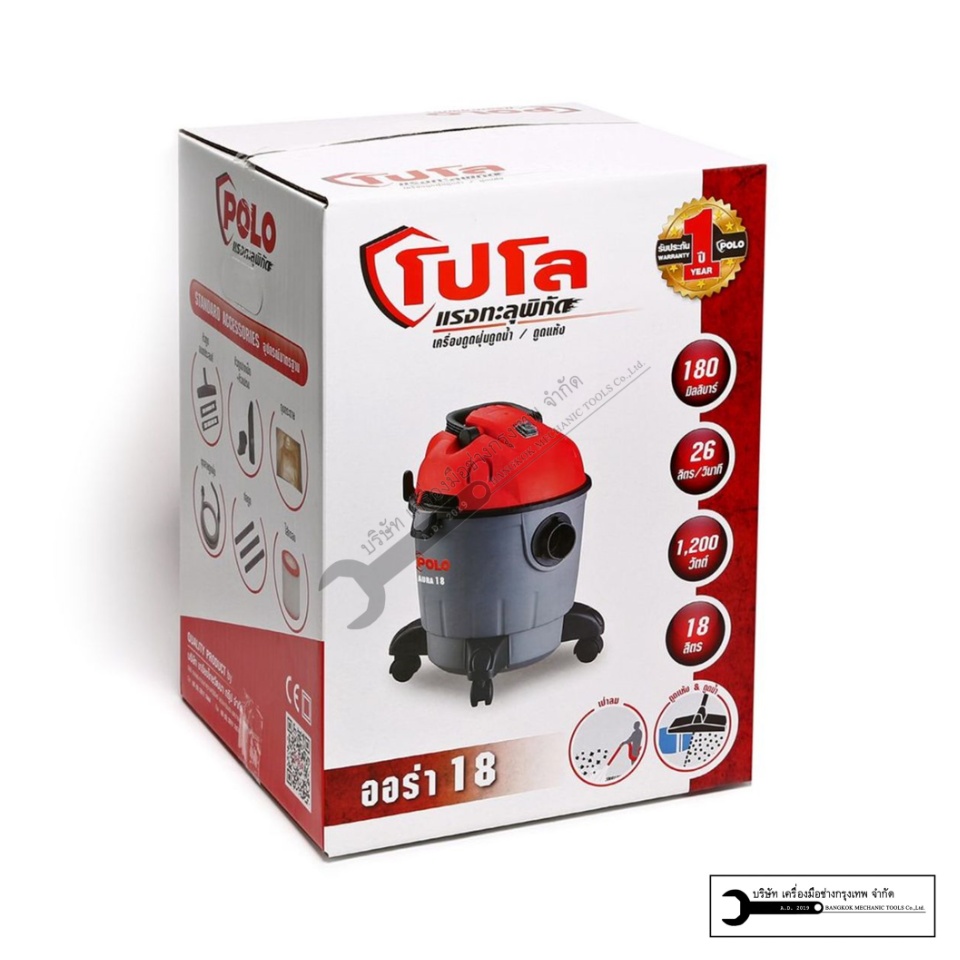 POLO เครื่องดูดฝุ่นน้ำ-แห้ง ขนาด 18ลิตร รุ่น AURA-18